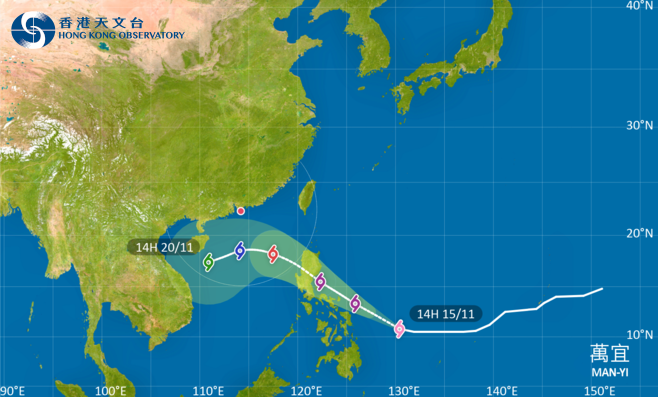天文台預料,「萬宜」將於周日(17日)晚至下周一(18日)初時進入本港800公里範圍。(天文台網圖)