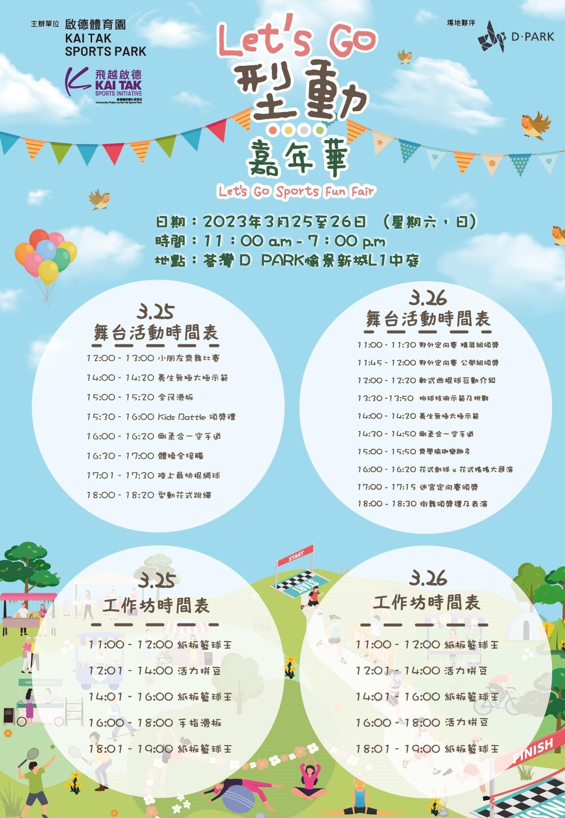 啟德體育園及旗下社區項目「飛越啟德」將於3月25至26日(星期六、日)一連兩日在荃灣D•PARK舉辦「Let’s Go型動嘉年華」,場內有超過60個主題運動展銷攤位,以及多項新興及街頭運動、親子工作坊、 兒童街舞比賽、迷宮定向、電競遊戲及表演賽等不同活動。