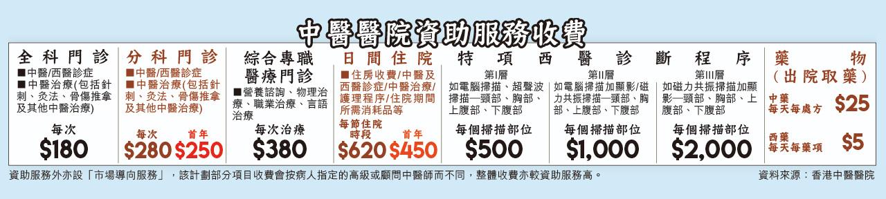 由政府補貼的資助服務將佔中醫醫院服務量六成半,當中的醫院全科門診及中醫治療,包括針刺、灸法、骨傷推拿等,每次診症收180元;綜合專職醫療門診,如營養諮詢、物理治療等,每次治療收380元,中藥每日處方25元、西藥每日每項5元,不同西醫診斷程序每個掃描部位收費則500至2,000元不等(詳見附表)。醫院開業首年部分項目提供七折至九折優惠,包括分科門診每次診症由280元減至250元、每個日間住院時段由620元減至450元,所有選用資助服務病人到診時必須登記醫健通。