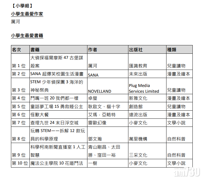 至於小學組,學生及教師「十本好讀」名單中,均有多本書籍涉科學及偵探題材,而小學生最愛作家是厲河,作品作《大偵探福爾摩斯47古堡謀殺案》亦同列為小學生最愛書籍榜首,該書改編著名偵探小說《夏洛克.福爾摩斯》,還加入數學疑難、科學實驗等內容,讓小學生容易代入偵探的角色。