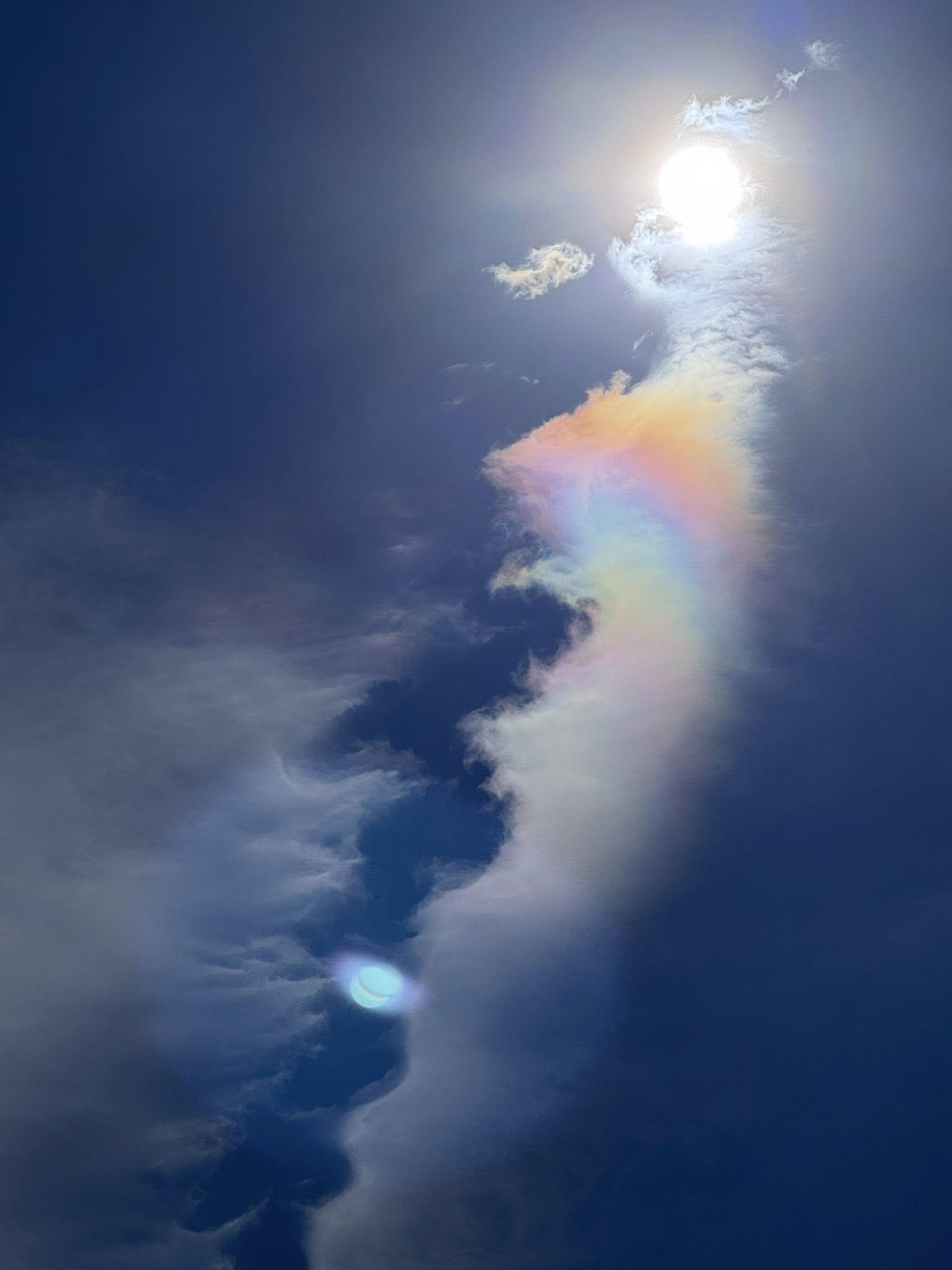 返回 本地 2025-10-13 18:16:23 香港驚現七色彩雲 天文台:因雲層水滴產生繞射形成 分享: 天文台在社交媒體上分享,指有市民早前發現到有劃破痕跡的七色彩雲。(天文台Facebook) 天文台在社交媒體上分享,指有市民早前發現到有劃破痕跡的七色彩雲。天文台指,出現此美景,原因是消散尾跡及虹彩雲。 天文台解釋,消散尾跡是因飛機穿過又薄又闊的雲層,飛機排出的熱氣蒸發了雲層入面的水滴,從而形成白雲被劃破的痕跡。 出現七色彩雲的原因,天文台指,是由於陽光穿過雲層水滴時產生繞射作用,形成虹彩雲的特殊光學現象。 ADVERTISEMENT
