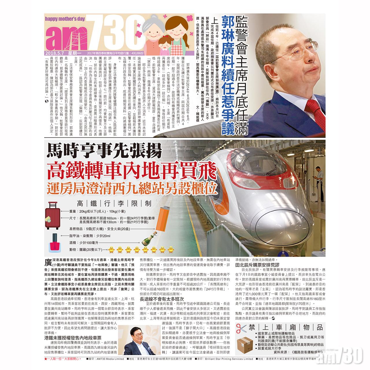 除購票安排外,馬時亨又在節目中透露指,因高鐵車廂不大,對行李體積會有一定限制。根據現時內地高鐵對於行李的限制,成人乘客的行李重量不可超過20公斤,「長闊高總和」不可以超過160厘米,大約相當市面售賣的「24吋行李箱」,但部分尺碼仍可能超出限制。