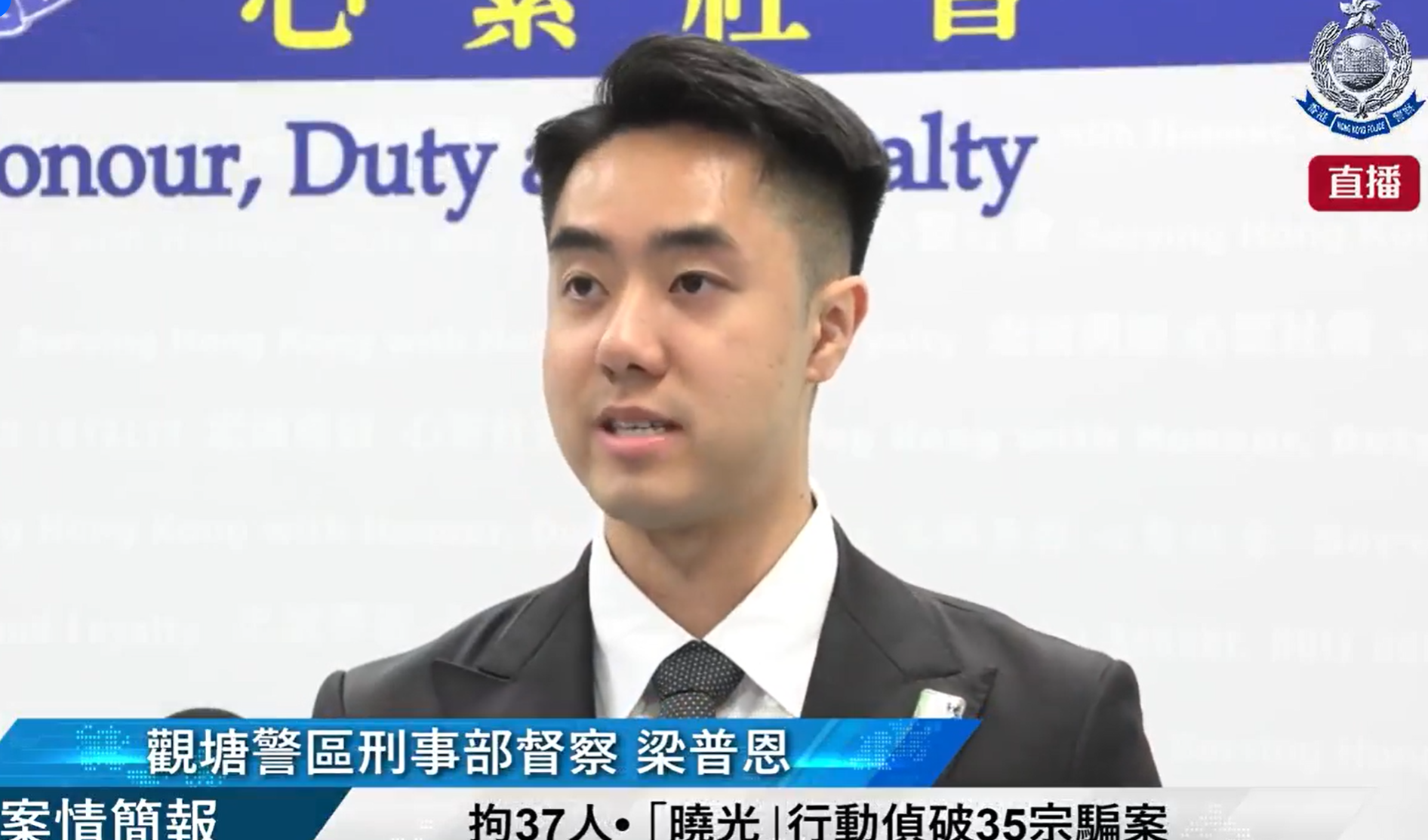 觀塘警區刑事部督察梁普恩表示,行動主要打擊科技罪案及網上騙案。(直播截圖)