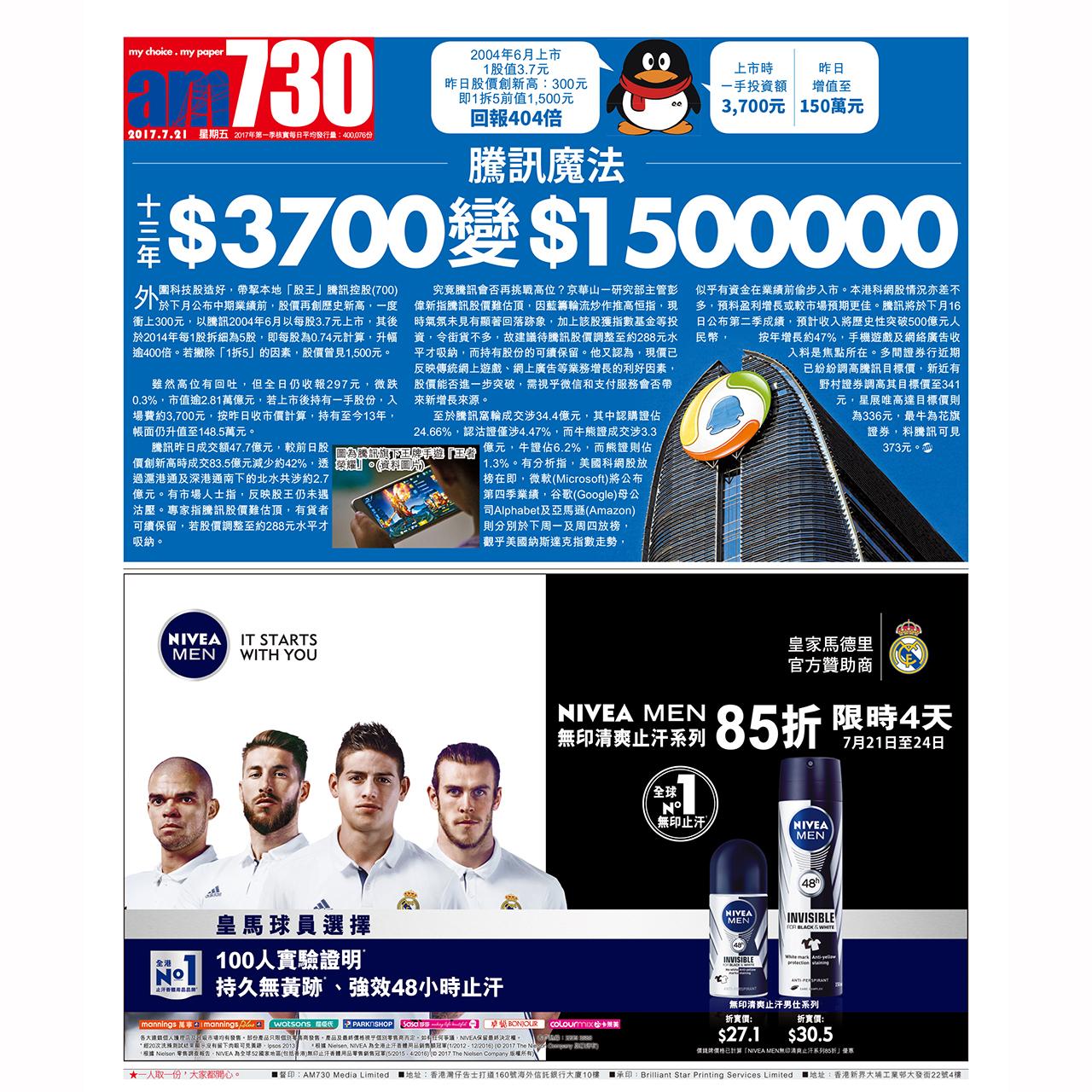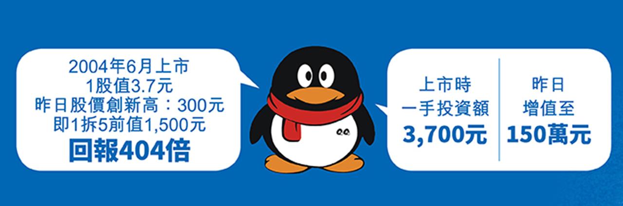 外圍科技股造好,帶挈本地「股王」騰訊控股(700)於下月公布中期業績前,股價再創歷史新高,一度衝上300元,以騰訊2004年6月以每股3.7元上市,其後於2014年每1股拆細為5股,即每股為0.74元計算,升幅逾400倍。若撇除「1拆5」的因素,股價曾見1,500元。