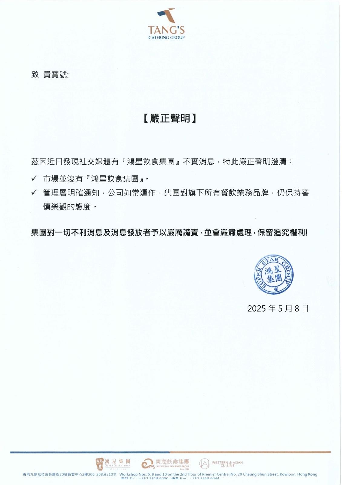 鴻星集團發聲明澄清,指鴻星如常運作,對旗下餐飲業務品牌仍保持審慎樂觀的態度。