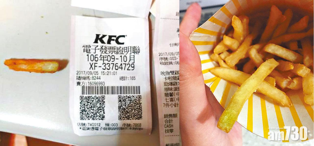 當地傳媒報道,一名網民日前在討論區指,從麥當勞買了兩包薯條回家,吃後覺得舌頭「有點怪怪的」,拿起薯條細看發現呈綠色,但未透露在哪間分店購買。另一名網民則稱在台南肯德基中華店吃到綠薯條,店員解釋綠色部分是葉綠素。肯德基回應,分店職員當時有主動提出更換一份薯條,但該名消費者表示不需補償。