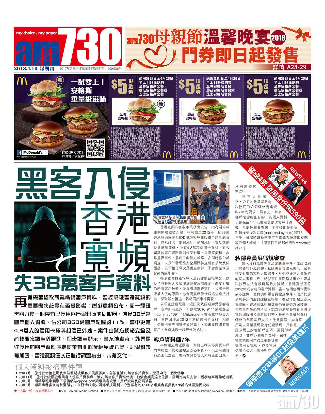 香港寬頻昨在收市後發出公告,指有關資料庫的伺服器被入侵,存有截至2012年、約38萬香港寬頻固網及IDD服務客戶和服務申請者的資料,包括姓名、電郵地址、通訊地址、電話號碼及身份證號碼,並有4.3萬項信用卡資料,而公司其他客戶資料庫則未受影響。香港寬頻稱,非常重視事件,前晚已向警方報案,亦即時作內部調查,以及外聘網絡安全顧問檢查所有系統及伺服器,公司相信今次是獨立事件,不會對業務及營運構成影響。
