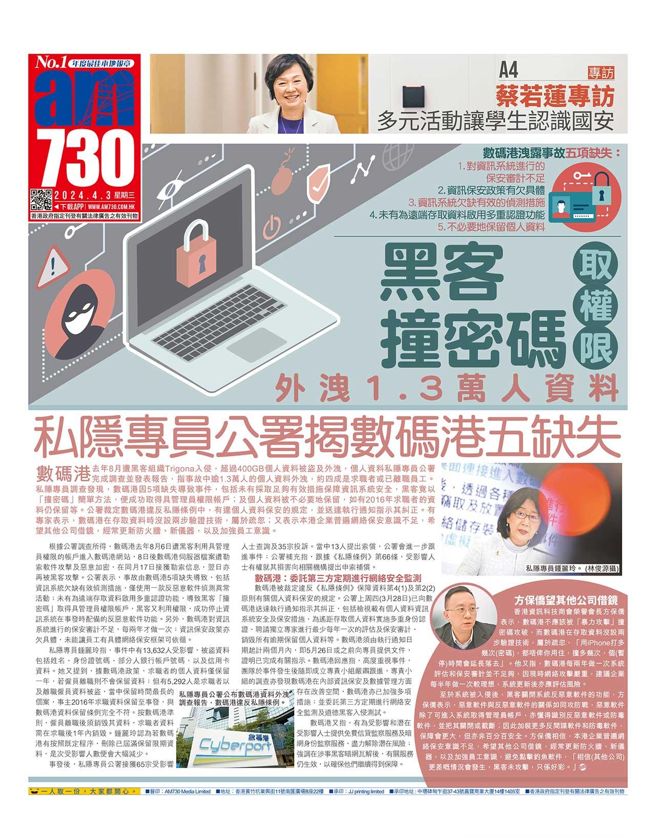 數碼港去年8月遭黑客組織Trigona入侵,超過400GB個人資料被盜及外洩,個人資料私隱專員公署完成調查並發表報告,指事故中逾1.3萬人的個人資料外洩,約四成是求職者或已離職員工。私隱專員調查發現,數碼港因5項缺失導致事件,包括未有採取足夠有效措施保障資訊系統安全,黑客竟以「撞密碼」簡單方法,便成功取得具管理員權限帳戶;及個人資料被不必要地保留,如有2016年求職者的資料仍保留等。公署裁定數碼港違反私隱條例中,有違個人資料保安的規定,並送達執行通知指示其糾正。有專家表示,數碼港在存取資料時沒設兩步驗證技術,屬於疏忽;又表示本港企業普遍網絡保安意識不足,希望其他公司借鏡,經常更新防火牆、新儀器,以及加強員工意識。
