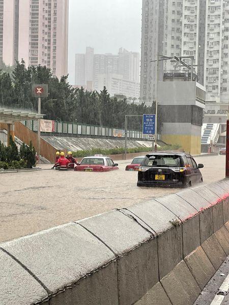 今日早上約9時,有市民發布照片,可見嗇色園黃大仙祠對開的龍翔道位置,水深及腰,有兩輛的士及一輛私家車疑被困在水中,消防員正在協助救援;而黃大仙中心北館水位亦未見退減,警鐘繼續響嗚。