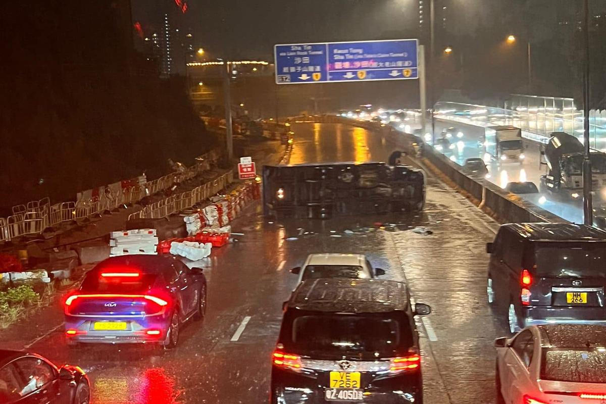 龍翔道有貨車失事翻側,橫亘三條行車線。(網上圖片)