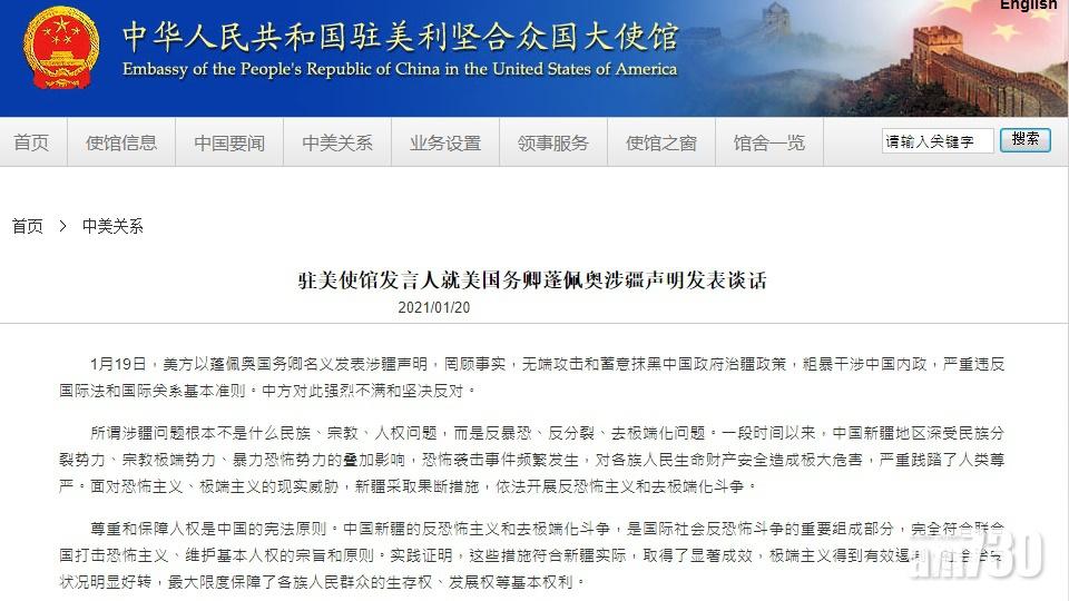 反駁蓬佩奧涉疆聲明,華駐美大使館:罔顧事實蓄意抹黑。(中國駐美大使館網頁截圖)