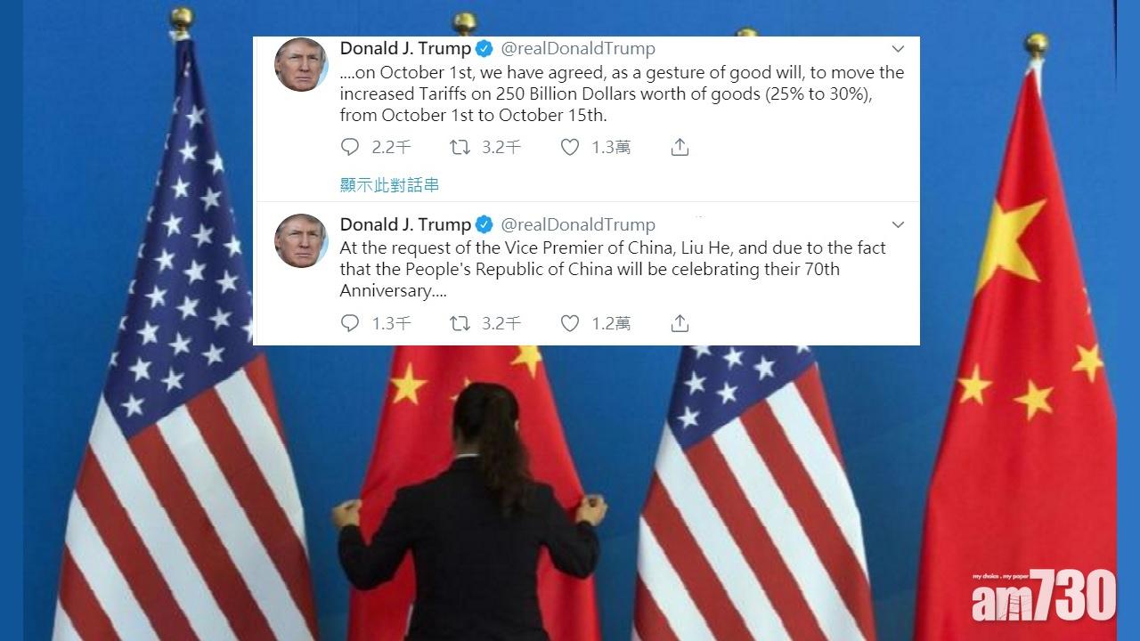 特朗普在社交網站發帖表示,將對價值2,500億美元的貨物由25%提高至30%的關稅的日期,從10月1日推遲到10月15日。