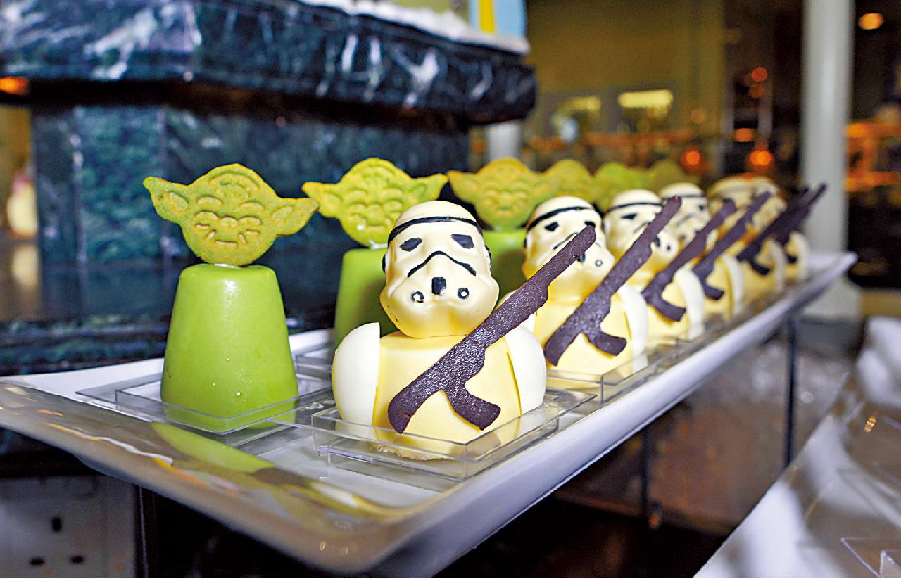 尤達大師、白兵、黑武士、IronMan矗立在餐桌上,均是陸繼光經多番揣摩後的傑作。入行逾30年的他分享「整餅」貼士時透露,要製作出造型維妙維肖的卡通人物甜品,要訣在於觀察每個角色的招牌動作,「始終(甜品)唔係畫出嚟,要表達到角色嘅神態同動作,先可以令人一眼認得出。」