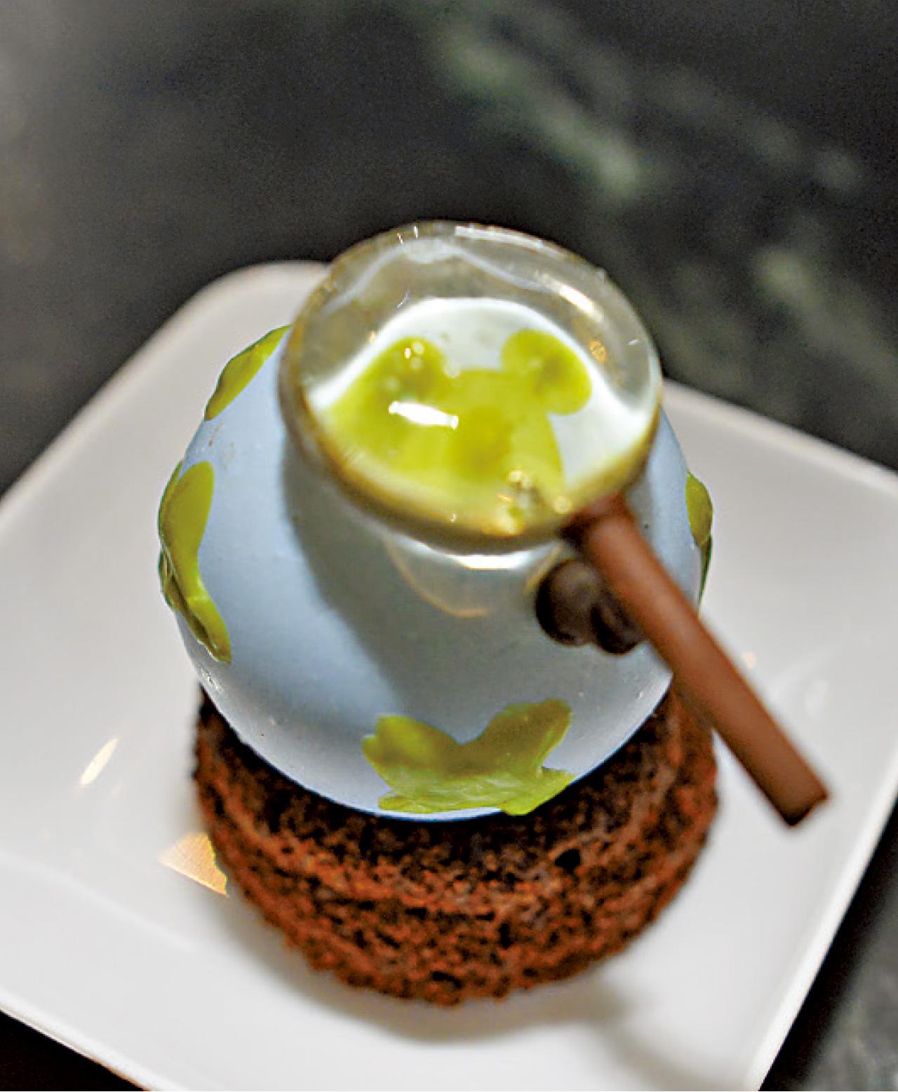 除IronMan外,另一個令陸繼光引以為傲的作品,是一個放有放大鏡下有球體的甜品,他指,小小的一片「放大鏡」其實內有乾坤,在煮糖時將糖漿煮成透明,並凝固成有弧度的糖塊,最終令成品可以食用之餘,亦真有放大鏡的功效。