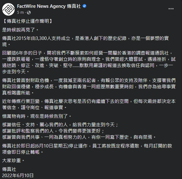 網媒《傳真社》在Facebook發聲明宣布,即日起(6月10日)停止運作,員工將按既定程序遣散,而每月訂閱的款項亦會即日停止轉帳。