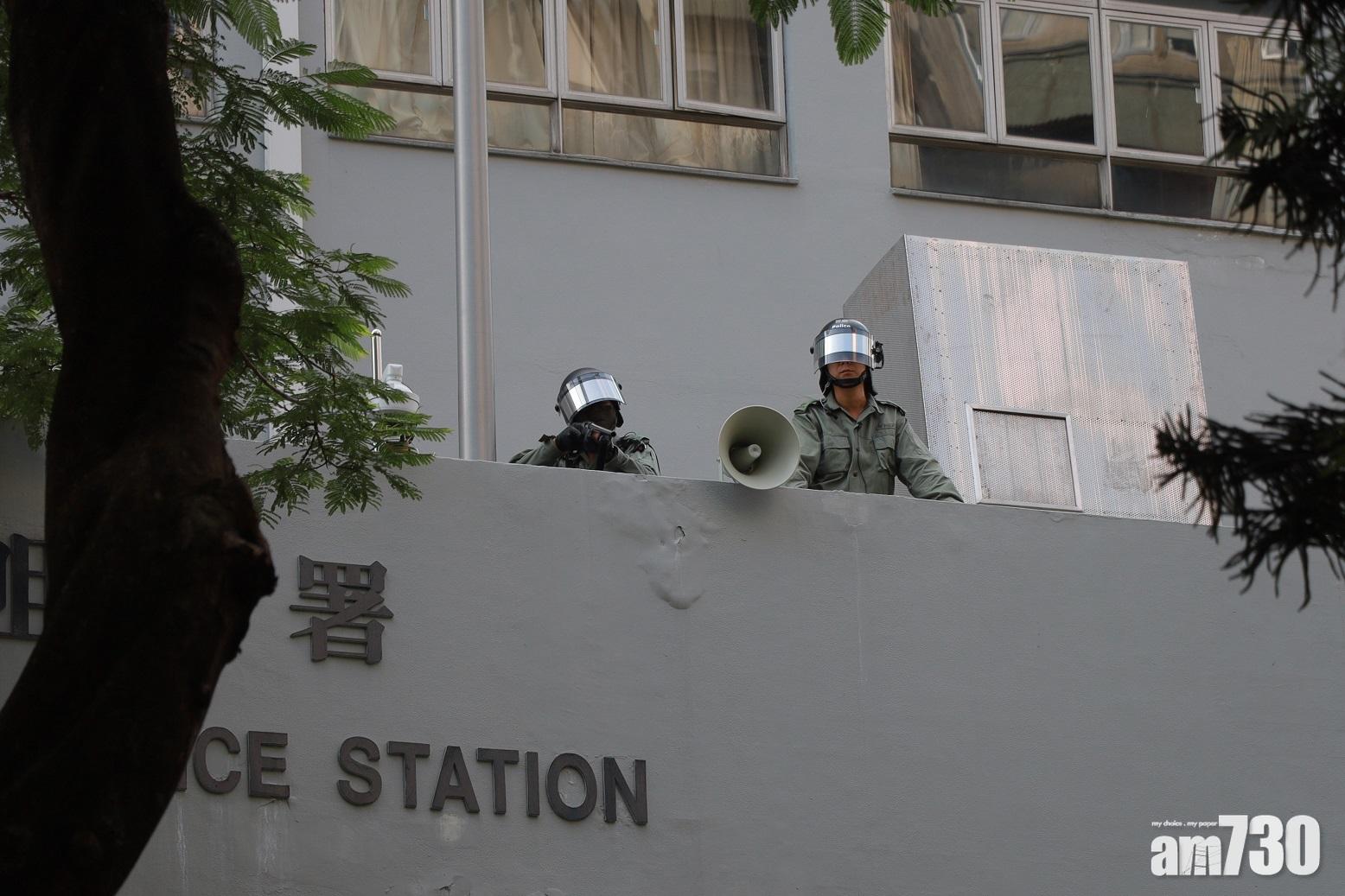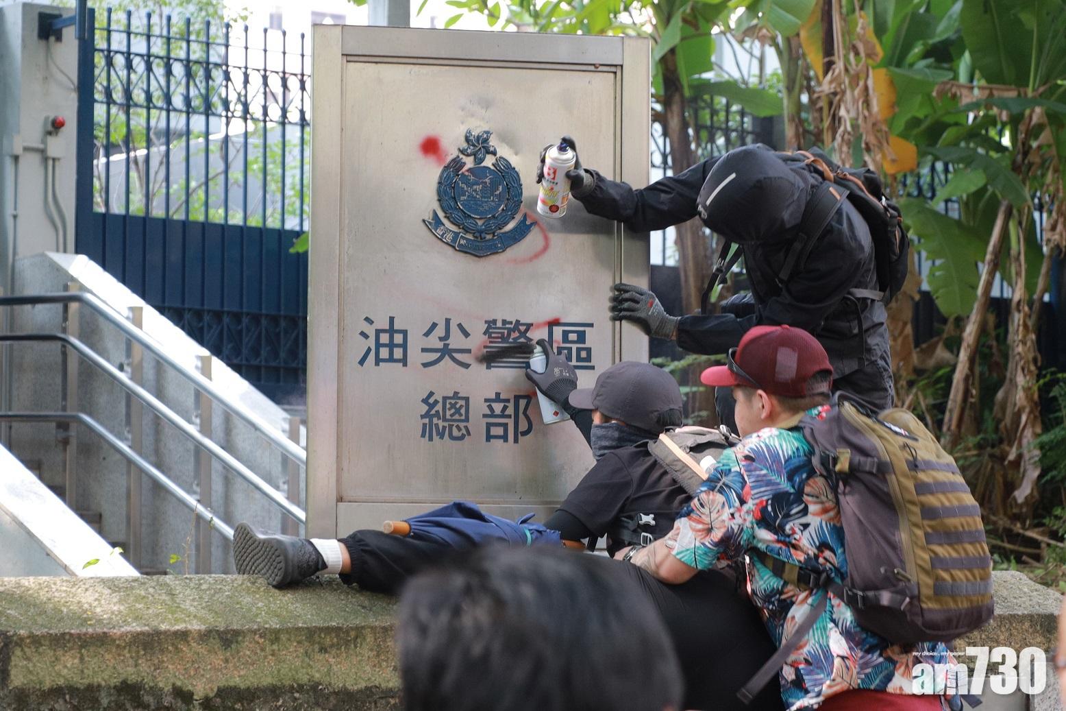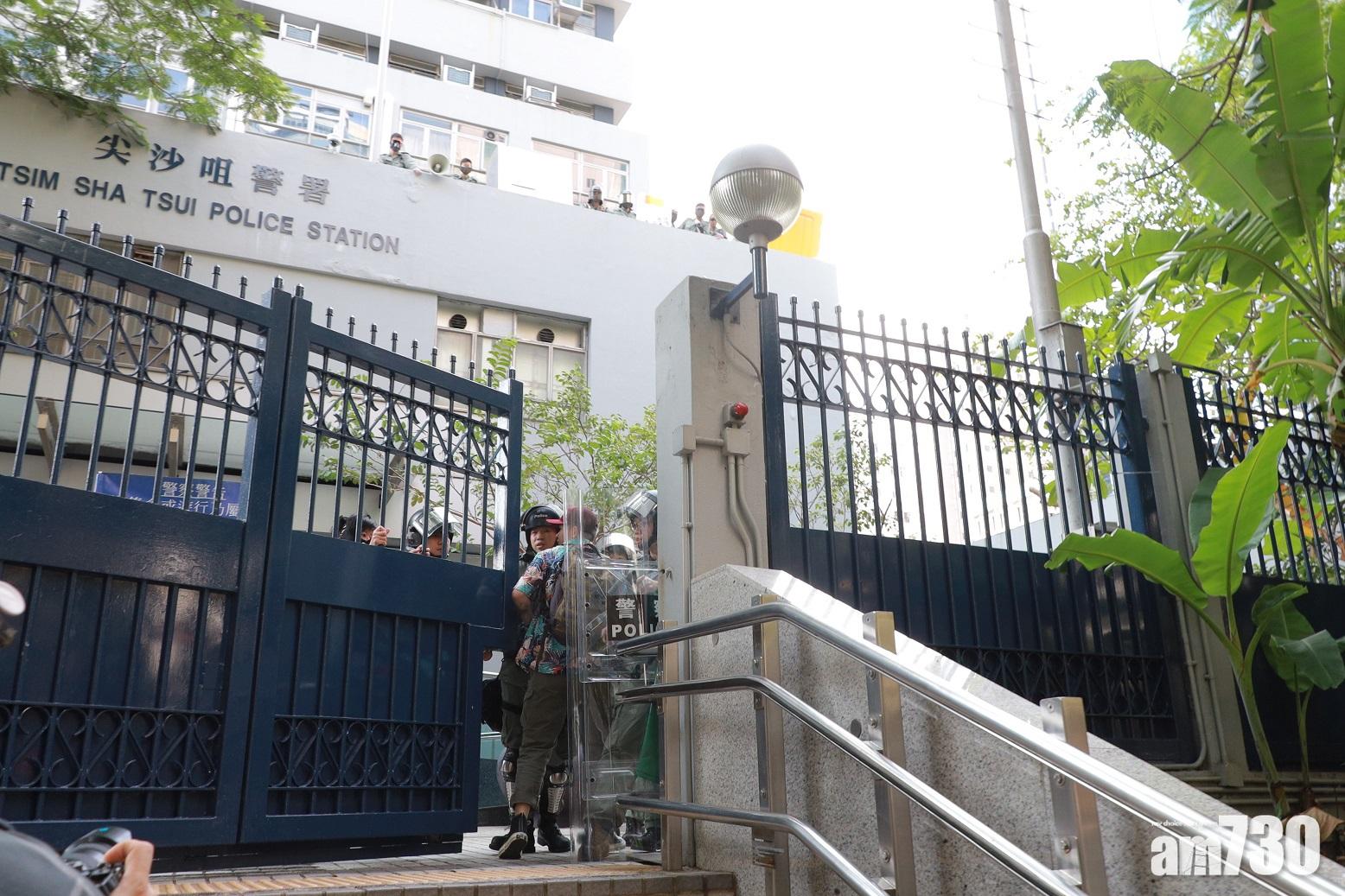 另外,部分遊行人士走到尖沙咀警署外聚集,有人塗污警署水牌,尖沙咀警署報案室服務暫停,警方籲市民如遇緊急事故,請致電999。警方在警署內展示藍旗並一度向聚集人士舉起防暴槍。