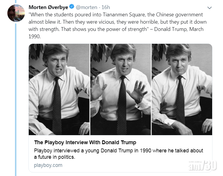 有網民指特朗普90年受訪時,似乎暗撐六四鎮壓。(互聯網)