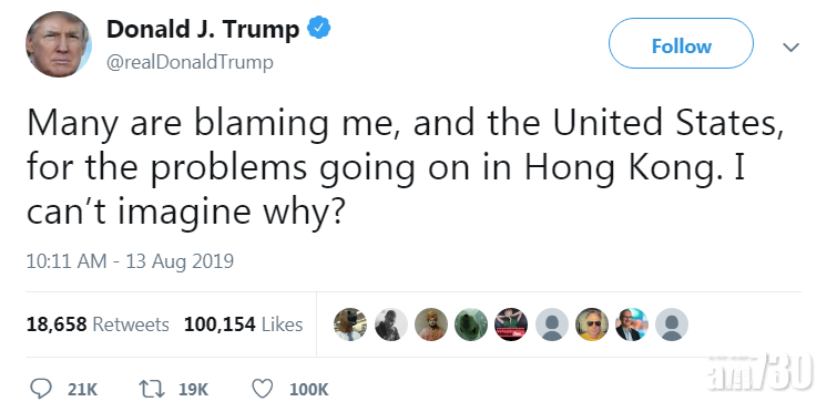 美國總統特朗普周二在Twitter連發兩個貼文,再度談論香港反修例示威,他在其中一個貼文稱,美國情報顯示中國正調動軍隊前往香港邊境,但這則「爆料」的網民留言數量,竟不及他另一則「嬲嬲豬」式貼文,他在當中埋怨道︰「很多人因為香港正在發生的事,罵我、罵美國。我想不到究竟為何?」(Many are blaming me, and the United States, for the problems going on in Hong Kong. I can't imagine why?)大批網民見特朗普如此苦惱,爭相解答,留言迅即突破2萬則!
