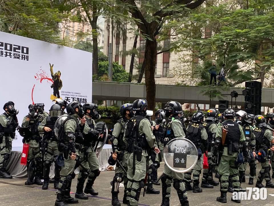 有水炮車及銳武裝甲車從上環從速駛往皇后像廣場外戒備,附近設有傘陣和著火的路障,防暴警察需落地清理。另外現場消息指,警方曾於長江集團中心外及原定集會地點的遮打道發射催淚彈,現場瀰漫大量白煙。