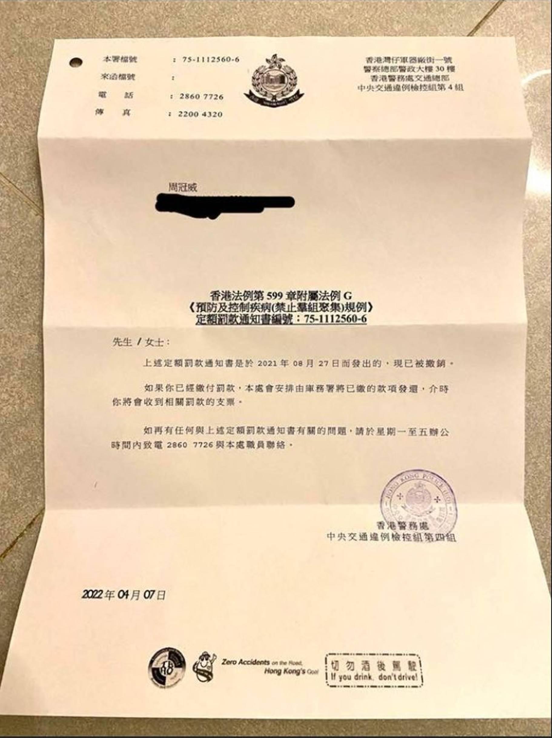 時任油尖旺區議員朱江瑋去年8月27日,在旺角辦事處舉行電影《幻愛》放映會,警方當時以違反限聚令為由,向在場人士發告票,包括《幻愛》導演周冠威。朱江瑋今(2日)在社交媒體Facebook發文,指43人全數已獲撤控,已交罰款人士亦獲退還罰款。