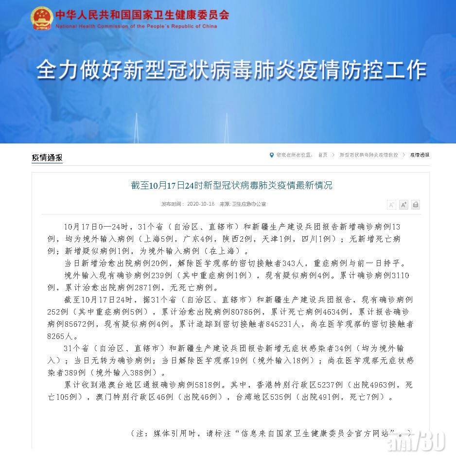 國家衛健委公布,內地在過去一天新增13宗確診,全部屬於境外輸入。(網頁截圖)