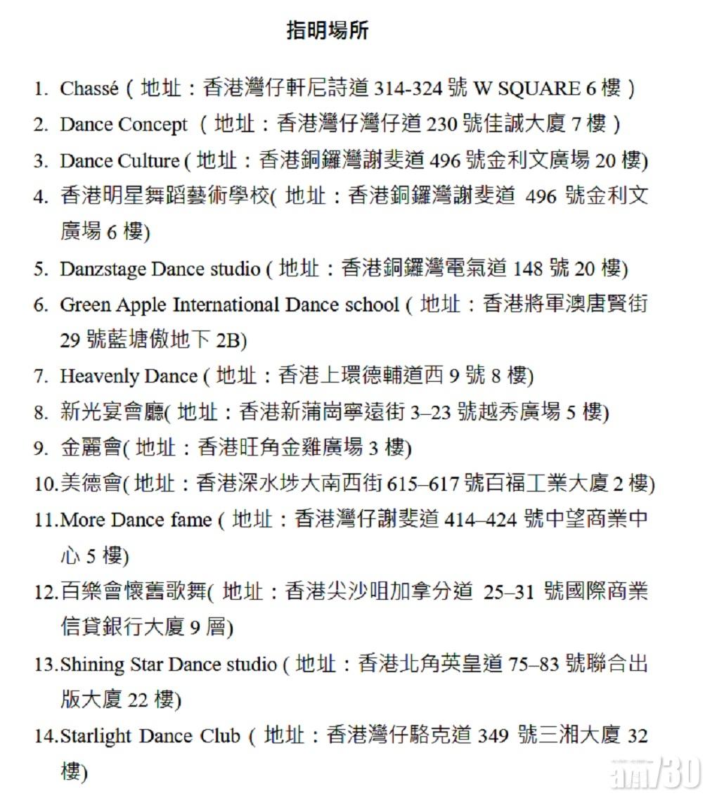 14間被政府指明須檢測的跳舞場所。(政府新聞處圖)