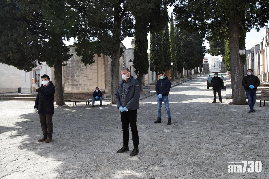 在意大利南部小鎮Cisternino,親屬出席一個葬禮時保持距離。(路透社)