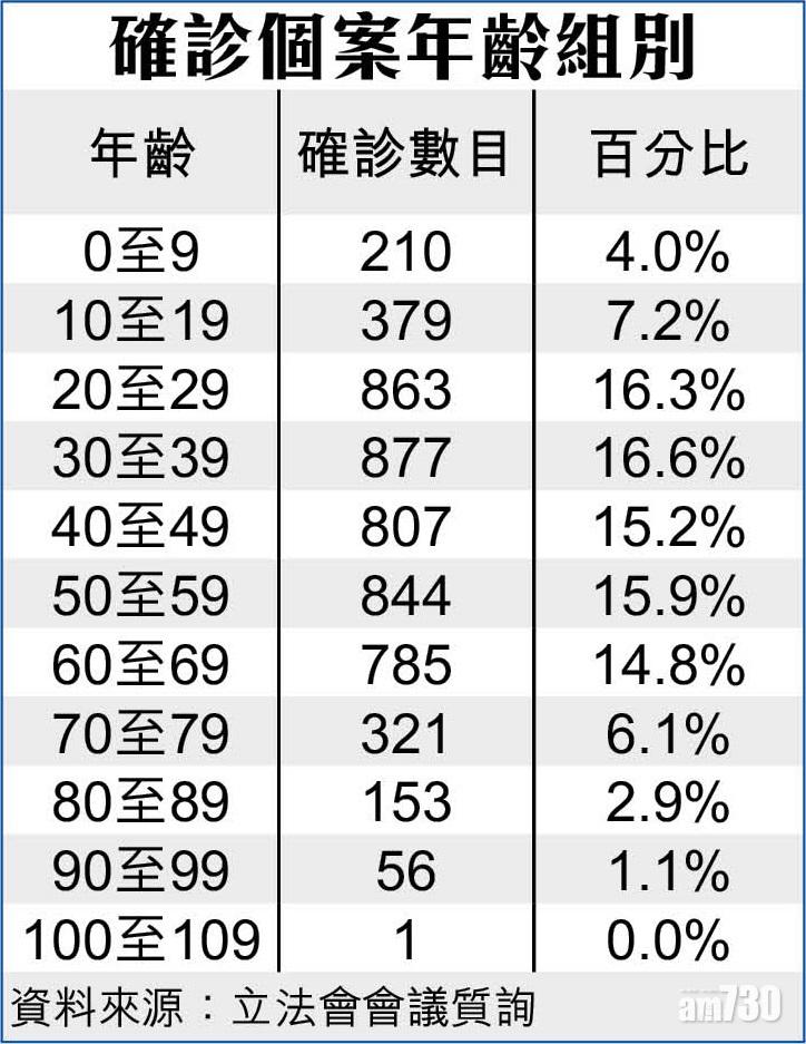 本港自年初爆發新型肺炎至今,醫學界立法會議員陳沛然就確診個案統計數字,在會議上向食物及衞生局長陳肇始提出書面質詢。陳肇始書面答覆指,在截至周日的5,296宗確診個案當中,有877人介乎30至39歲,佔總數近17%,其次是20至29歲組別,共863人、即總數約16.3%染疫,第三多的是50至59歲患者,共有844人、即總數約15.9%。
