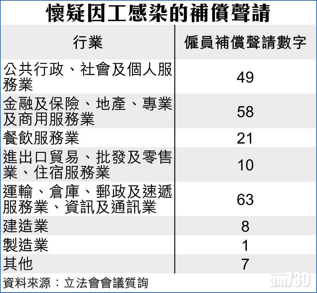 多個工會連月促請政府把新型肺炎納入職業病,答覆提到勞工處截至上月30日,共接獲217宗懷疑因工感染新型肺炎的僱員補償個案,包括「公共行政、社會及個人服務業」、「金融及保險、地產、專業及商用服務業」及「運輸、倉庫、郵政及速遞服務業、資訊及通訊業」等。其中215宗個案的僱主已向勞工處作出呈報。在已呈報個案中,有1宗因僱主已根據勞工處長發出的補償評估證明書支付補償款項而完結,另有16宗因僱員撤銷申索或沒有回應勞工處而未能繼續跟進,勞工處正跟進餘下個案。