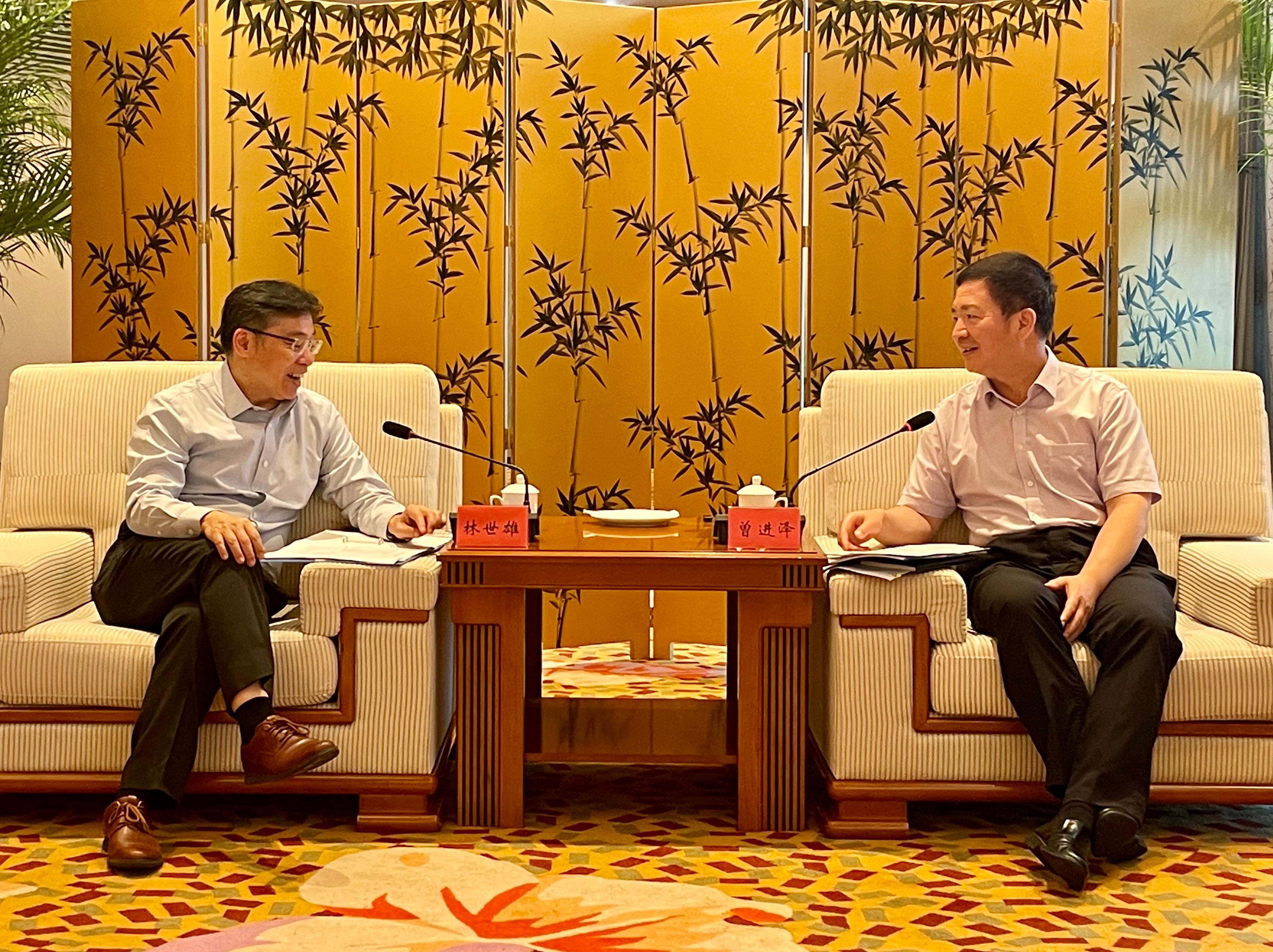 運輸及物流局局長林世雄(左)今日(5日)與湛江市人民政府市長曾進澤(右)會面,商討兩地合作的機遇。(政府新聞網圖片)