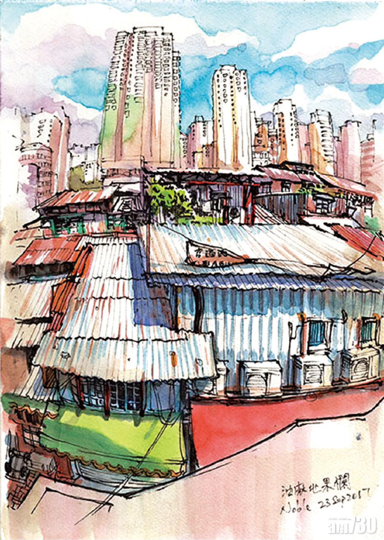 黃志豪,油麻地果欄鐵皮屋,鋼筆水彩紙本