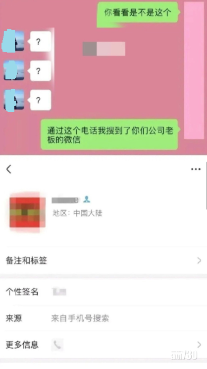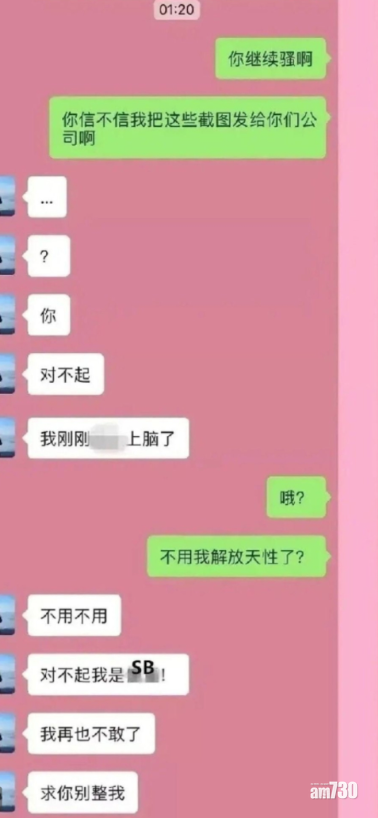 部分人會透過即時通訊軟件識陌生朋友,但內地網民帖文「沒事千萬別用微信撩附近的人,看看這就是下場」,當中樓主貼出微博對話,開始時一名男子凌晨1時許問「在嗎?自己在家?喜歡腹肌?想不想看哥的腹肌?」樓主只是嗯嗯嗯敷衍回應,但明確稱不想看對方腹肌。而男子繼續發功「別給臉不要臉?你是尼姑?你不需要在我這裝矜持,請你解放天性……」樓主仍不大理會對方;及至男子想要用視像聯絡樓主遭拒,樓主著男子「等會」,之後火速透過看男子微信朋友圈內資料,知悉男子姓名、在甚麼公司工作,公司的聯絡方法等,並告之男子她已掌握其資料,著男子不要繼續騷擾她,否則會將對話截圖發給男子的公司。