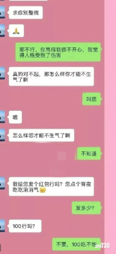 男子此時大驚,向樓主求饒及道歉,並稱「你怎樣才能不生氣」,又主動建議向樓主發100元紅包,讓她叫宵夜消消氣,樓主回應100元吃不飽,最後男子轉發了500元,重申要求樓主不要通知其公司。樓主收錢後,答允不知會其公司,但補充「下次不許調皮了,要腳踏實地的工作做個正能量的人知道嗎?」男子亦承諾,再也不敢了。