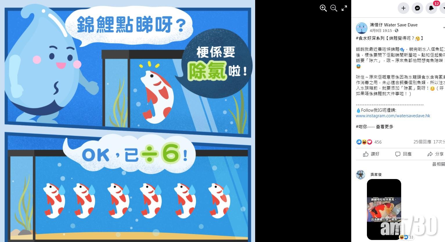 不少機構或政府會運用社交平台與群組接觸,而政府不同部門更開設不同平台介紹工作或相關小知識。水務署吉祥物——滴惜仔Water Save Dave Facebook專頁中,最近以輕鬆手法提醒養錦鯉的水質不能帶氯氣,帖文指「話說我最近養咗條錦鯉,裝完啲水入個魚缸之後,梗係要問下佢點睇間新屋啦~點知佢起勢咁話要「除六」,哦~原來魚都怕悶想有魚陪㗎!