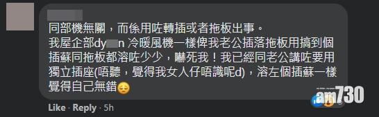 網購電器的帖文,當然少不免質疑為何不在香港購買合規格貨源。人妻Ho指出,事件未必與暖風機有關,即使家用「Dyxxn冷暖風機」一樣「出事」,因為其丈夫沒有理會自已勸喻,堅持經拖板取電,最後拖板與暖風機插頭「都溶咗少少」;Ho的友人亦有留言,令Ho擔憂丈夫知悉自己發文訴苦,要求其友人「咪報串」,令充滿火藥味的帖文頓時充滿喜感。