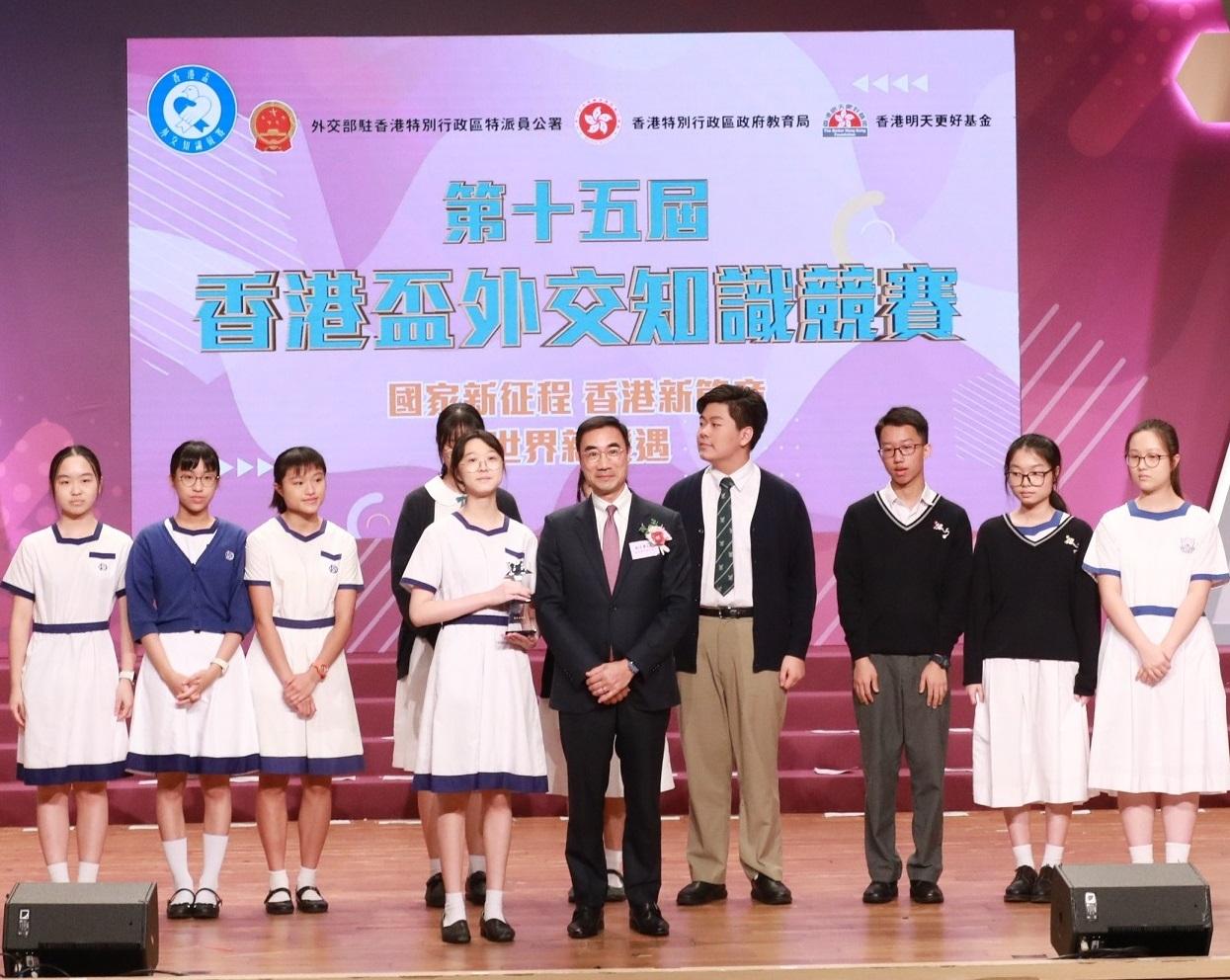 「香港盃外交知識競賽」由外交部駐港公署、教育局及香港明天更好基金聯合主辦,香港賽馬會為特別贊助機構。決賽現場氣氛熱烈,經過激烈角逐,由仁濟醫院王華湘中學勇奪總決賽精英賽金獎,中華傳道會安柱中學和沙田培英中學獲銀獎,拔萃女書院和皇仁書院獲得銅獎。
