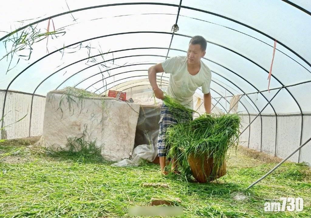呂男用新鮮草餵蝗蟲。(互聯網)