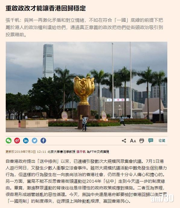 政府修訂《逃犯條例》觸發大規模遊行,立法會更被部分示威者損毀。北京大學法學院教授張千帆在《金融時報》刊出文章,指香港最近頻繁的大規模抗議表明,港人是有政治訴求和行動能力,光靠高壓手段是不現實的,呼籲港府及北京政府與其一再激化對立情緒,不如在符合「一國」底線的前提下把屬於港人的政治權利還給港人,並認為只有推行真正的政改,才能幫助中央贏得港人的好感和信任。