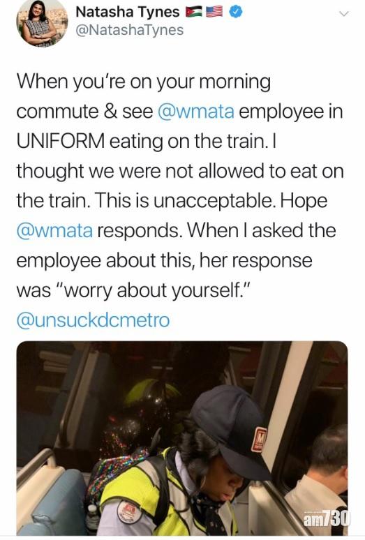 美國馬里蘭州女作家泰納斯(Natasha Tynes),上月在華盛頓偷拍一名鐵路公司黑人女職員在列車上吃早餐,於Twitter貼相並留言投訴:「早上乘列車,在車上見到一名穿著制服的職員吃東西,我認為是不准在列車上進食的。不可接受。希望有回應。」泰納斯其後應鐵路公司要求,提供事發時間及列車行駛方向等資料。