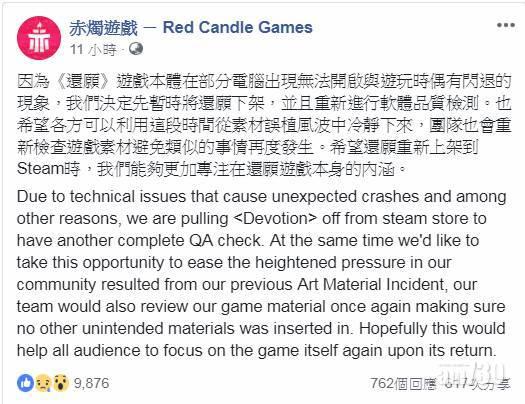 陷入侮辱國家主席習近平風波的台灣恐怖解謎遊戲《還願》,今日凌晨突然在美國遊戲平台Steam下架,《還願》開發商「赤燭遊戲」今早在Facebook發文,指「遊戲本體在部分電腦出現無法開啟與遊玩時偶有閃退的現象,因此決定先暫時將還願下架,並且重新進行軟體品質檢測」。