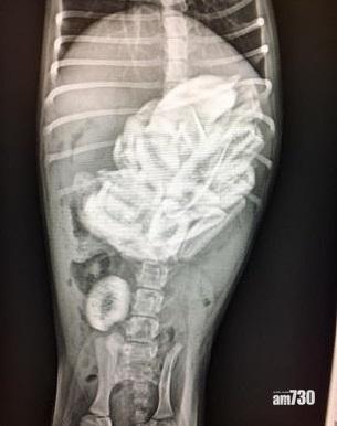 獸醫在狗狗胃部取出大堆牛仔骨。(互聯網)
