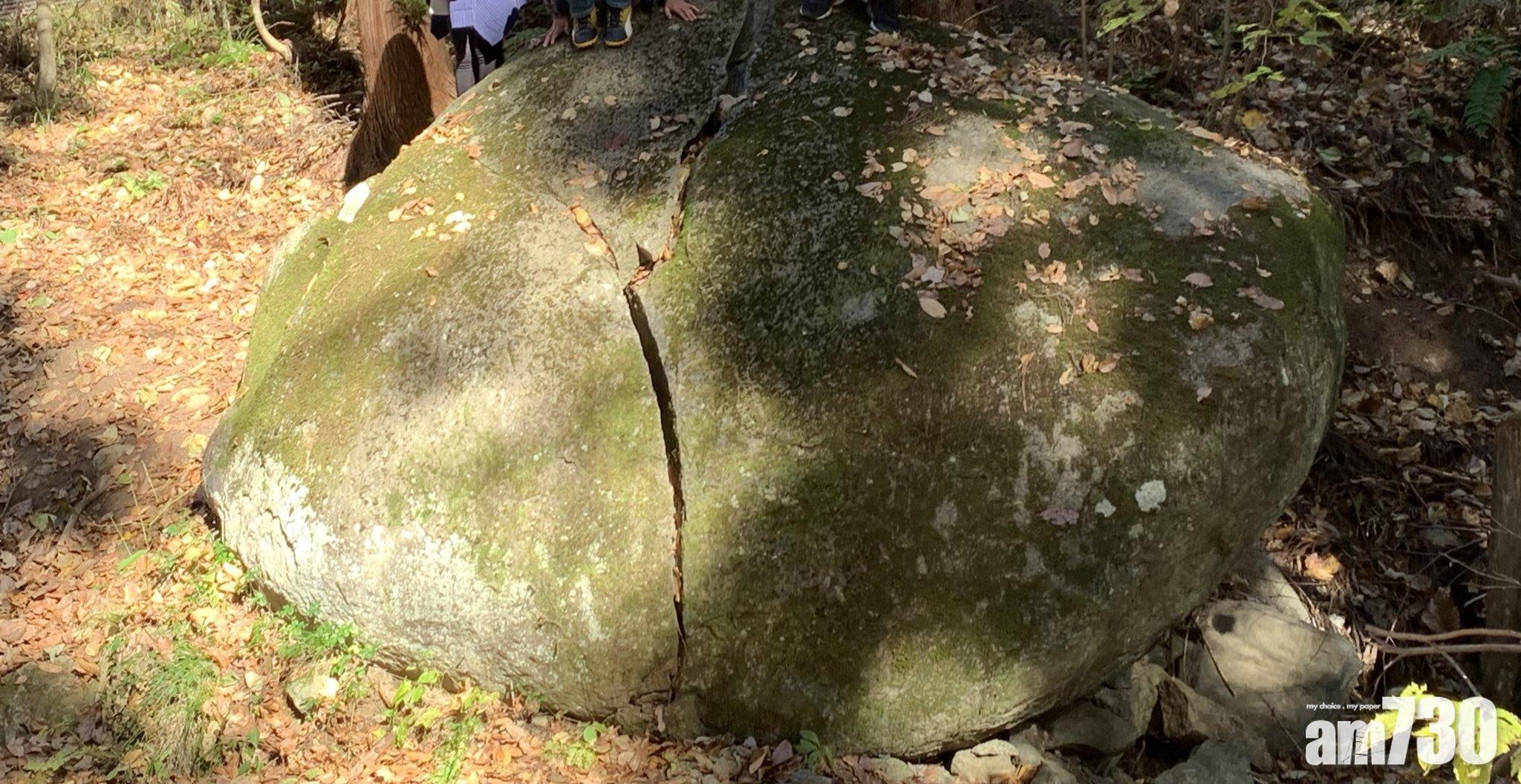 這塊裂縫巨石因為和《鬼滅之刃》中的主角炭治郎在進行訓練時所劈開的大岩石非常相似,成為爆紅原因。(Twitter圖片)