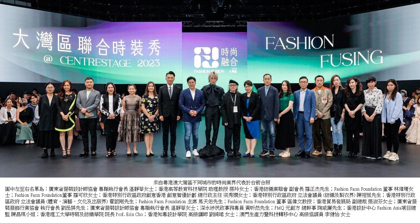 由香港特別行政區政府「創意香港」贊助,並由非牟利時裝推廣機構Fashion Farm Foundation (FFF)主辦的第三個粵港澳大灣區(大灣區)大型時尚項目「大灣區:時尚融合2023」其中一項重點活動「FASHION FUSING大灣區聯合時裝秀」先後成功聯動「廣東時裝週2023」及「深圳原創時裝週AW 2023」,壓軸一站回到香港,率領來自香港及大灣區其他城市的年輕時設計師及時裝院校超新星於9月6日亮相CENTRESTAGE 2023的大舞台,寫下劃時代的時尚新章。全場星光熠熠,FFF邀請了一眾來自粵港澳大灣區不同城市的時尚業界代表出席支持,還有時裝迷、時尚媒體、全球買手紛紛前來見證大灣區設計新星的精彩作品。