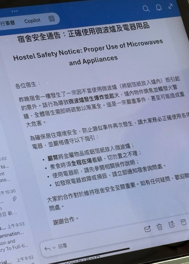 通告強調為確保居住環境安全,防止類似事件再次發生,要求宿生務必正確使用各項電器,並嚴格遵守指引:嚴禁將金屬物品或鋁箔紙放入微波爐;煮食時須全程在場看顧,切勿置之不理;使用電器前,請先參閱相關操作說明;如發現電器故障或損毀,請立即通知宿舍詢問處。