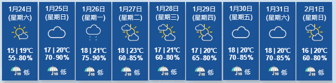 天文台指乾燥的東北季候風正影響華南,而覆蓋沿岸地區的雲帶稍為轉薄。本港地區今日(24日)天氣預測部分時間有陽光,日間乾燥,吹和緩東北風,漸轉吹東風,最低14度,最高約19度。展望明日風勢較大,隨後一兩日大致多雲,較為潮濕。