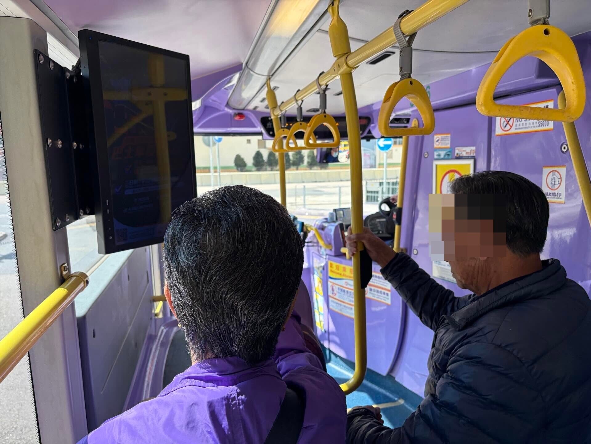 該名巴士乘客周日於Threads發帖表示,「多咗老人家企位,大家健康咗」。照片可見他登上一輛城巴從南區鴨脷洲邨開出,一男一女長者站在輪椅位附近扶着扶手,未有於下層坐下,惟未知該車座位是否已增設安全帶。