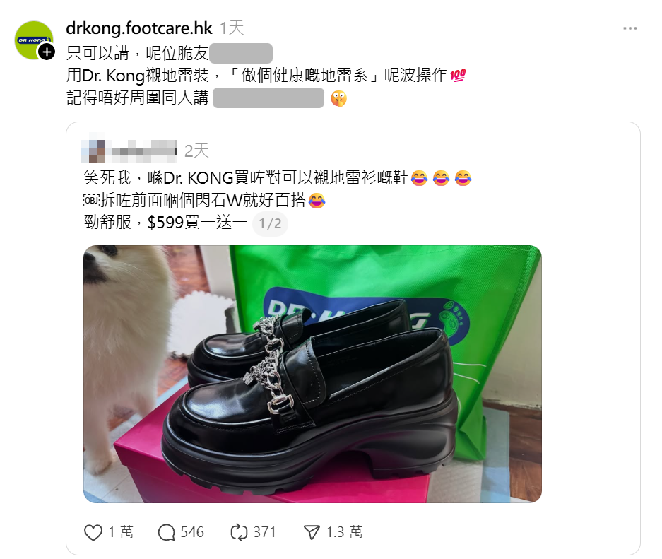 帖文其後瘋傳,不少年輕女網民隨即搶購,「多謝樓主推介,今日即刻去咗買。左腳用鉗拆咗兩粒W。另外買一送一揀咗對銀色ballet flat」、「店員小姐話呢兩日好多人試呢對鞋」、「真係好舒服仲要夠哂高、完全就係為追星人而設」、「唔係你出po,大家對Dr. Kong印象仲停留喺老土學生鞋款」、「大癲,身邊朋友個個即刻話要去買」、「我對dr kong嘅印象仲係勁out嘅鞋款 居然會有呢種類型嘅」、「Dr. Kong應該冇諗過有日會變地雷brand」、「地雷要健康,去搵Dr.Kong」、「做個健康嘅地雷妹」、「Dr Kong 成年生意額都唔夠呢幾日勁」、「成單嘢有大寶冰室feel」。