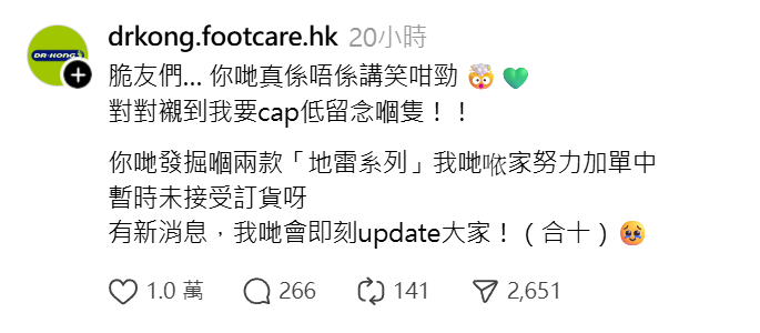 健康鞋專門店Dr. Kong的鞋履是不少學童的「童年品牌」,旗下一款厚底皮鞋近日於社交平台Threads因被網民推介突然爆紅,掀起搶購熱潮,由於有599元買一送一優惠,帖文其後瘋傳,吸引不少喜愛日系裝扮及看演唱會「增高」的女生到門市入手,導致全線門市斷貨。對於品牌突「翻生」,不少女生留言笑稱要入手做個「健康的地雷妹」、「Dr. Kong應該沒想過自己會變成地雷Brand」、「成單嘢有大寶冰室feel」。