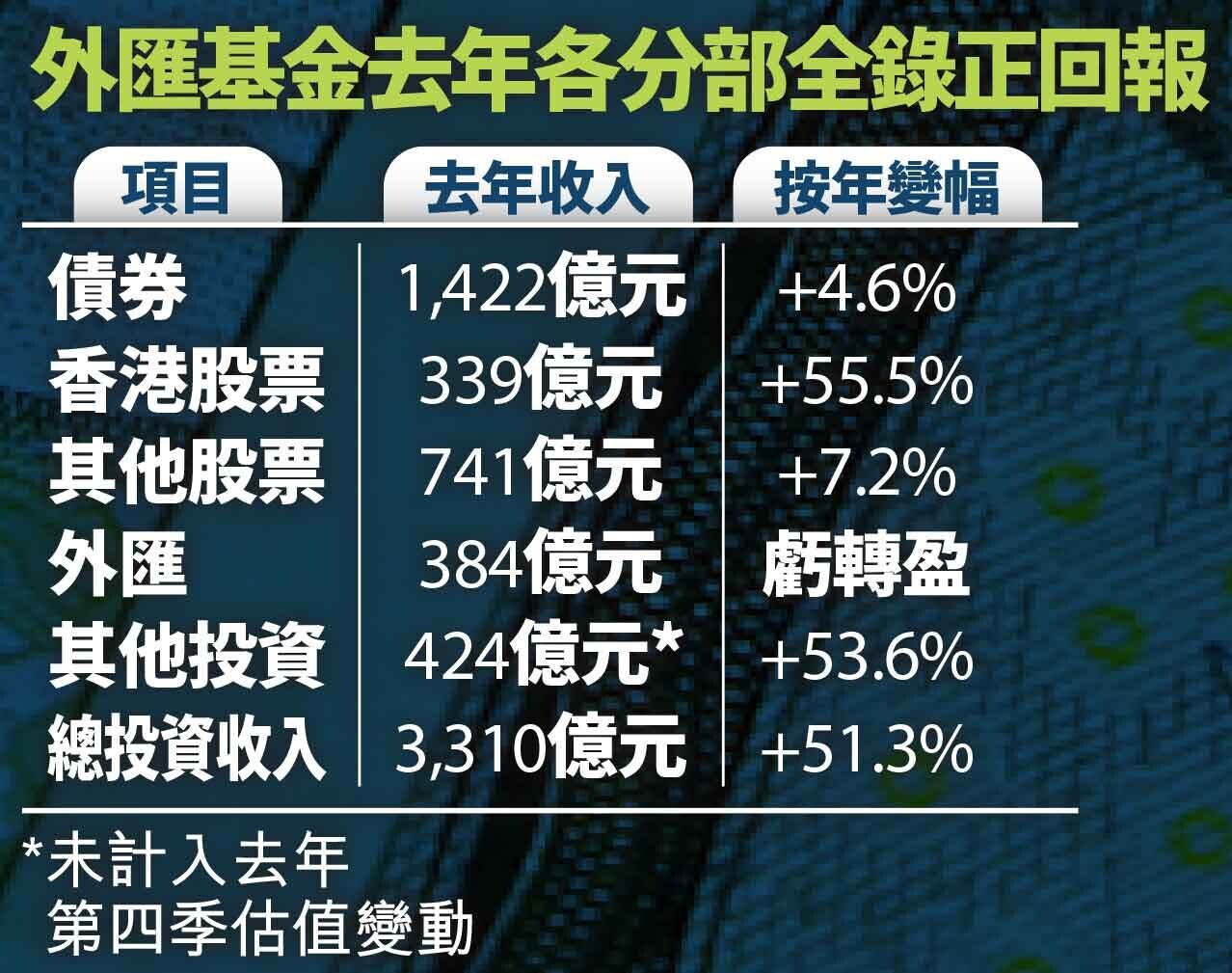 單計第四季,外匯基金回報462億元,按年虧轉盈,按季少34.7%。上季香港股票回報虧損62億元,債券則錄回報296億元,其他股票回報146億元。