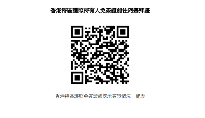 入境事務處表示,阿塞拜疆是「一帶一路」沿線國家。此免簽證安排為香港特區護照持有人帶來便利,並有助兩地加強旅遊、文化和經濟方面的聯繫。連同阿塞拜疆在內,已有共175個國家及地區給予香港特區護照持有人免簽證或落地簽證待遇。詳情請瀏覽網頁或掃描二維碼。